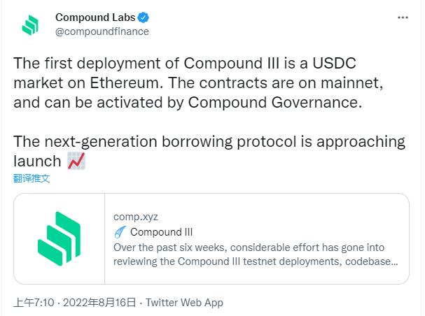 MarsBit消息,DeFi 借贷协议 Compound 发推称,即将推出其第三个版本多链借贷协议 Compound III(Comet),将首先在以太坊上部署 USDC 市场,目前已经在主网上部署合约,将由 Compound 治理激活。6 月底, Compound Labs 向社区发布多链借贷协议 Compound III 代码库。Compound III 的设计考虑到借款人,具有资本效率、Gas 效率、安全且易于管理。主要更改包括:Compound III 部署具有单一的可借(生息)基础资产、为每个抵押资产设置抵押大小限制、有单独的借款抵押因子和清算抵押因子、风险管理 / 清算引擎已完全重新设计、直接使用 Chainlink 进行喂价等。