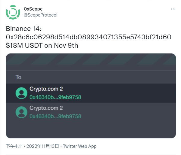 MarsBit消息, Web3知识图谱协议0xScope统计过去一周从币安热钱包转入Crypto.com钱包的资金流动数据,共计1.2亿枚USDT,均发生在Crypto.com公布冷钱包地址之前。 在11月8日-10日,共计7200万枚USDT从Binance 17地址(0x56eddb7aa87536c09ccc2793473599fd21a8b17f)转入Crypto.com 2钱包。 11月11日,3000万枚USDT从Binance 16地址(0xdfd5293d8e347dfe59e90efd55b2956a1343963d)转入Crypto.com 2钱包。 11月9日,1800万枚USDT从 Binance 14地址(0x28c6c06298d514db089934071355e5743bf21d60)转入Crypto.com 2钱包。 据此前报道,11月11日,Crypto.com首席执行官Kris Marszalek公布其平台约30亿美元储备的多个冷钱包地址,包括约53024枚BTC、391564枚ETH以及其他资产。Kris Marszalek补充说,这只是Crypto.com储备资金的一部分,未来几周内Crypto.com将提供完整的经过审计的储备证明,确认所有客户资产的全部1:1储备。