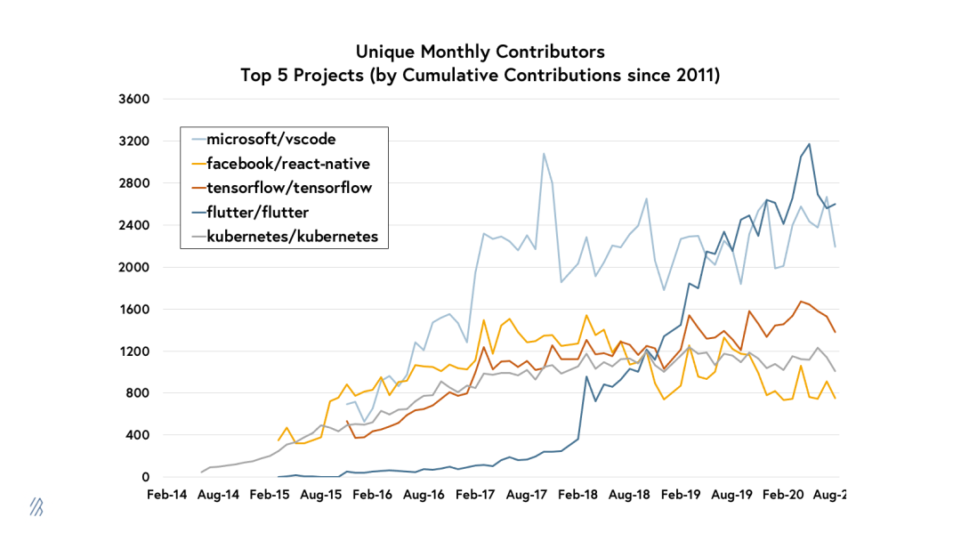 在讨论最大的开源项目社区时,不可能不碰到来自科技巨头的项目。有史以来排名前五位的开源项目分别来自Google,Microsoft和Facebook。这些项目在现代软件开发和云基础架构中起着根本性的作用,它们建立了令人难以置信的大型社区,每个社区每月都有1000多个贡献者。有趣的是,每个项目都已成为各自类别中最流行的一两个技术,包括VSCode(注:一款开源免费跨平台代码编辑器,广泛使用的IDE),Kubernetes(Google开源的一个容器编排引擎,它支持自动化部署、大规模可伸缩、应用容器化管理)以及React Native和Flutter(两个最受欢迎的跨平台前端框架)。