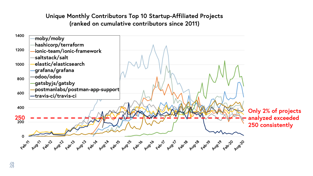 在参与度方面,Moby项目(Docker背后的基础项目)以及最近的Gatsby,在该图表上都是显著高于同类型其余项目的平均值。表中其余项目的平均每月贡献者数量分布在200至600之间,绝对是同类中的头部水平。在我们分析的前10000个项目中,不到5%的项目每个月拥有250个以上的贡献者,而只有2%的项目在6个月或更长时间内始终超过250个贡献者。