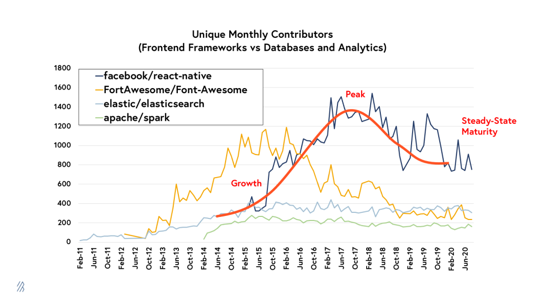 上图显示了项目参与度随时间变化的曲线,说明了流行的前端项目(如React Native和Font Awesome)与流行的数据库和分析引擎(如ElasticSearch和Apache Spark)之间规模的差异。