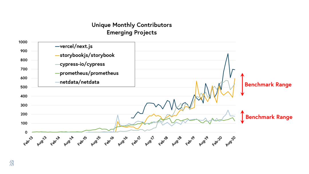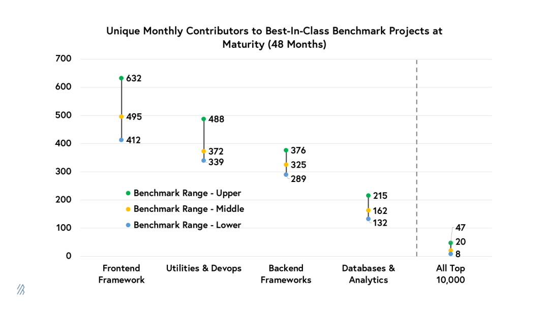 尽管我们使用这些范围来提供每个类别中一些顶级开源社区如何发展的背景信息,但我们并不将这些基准范围视为定义成功的严格规则。