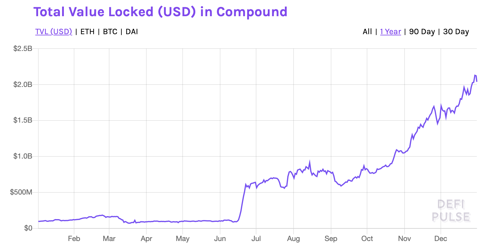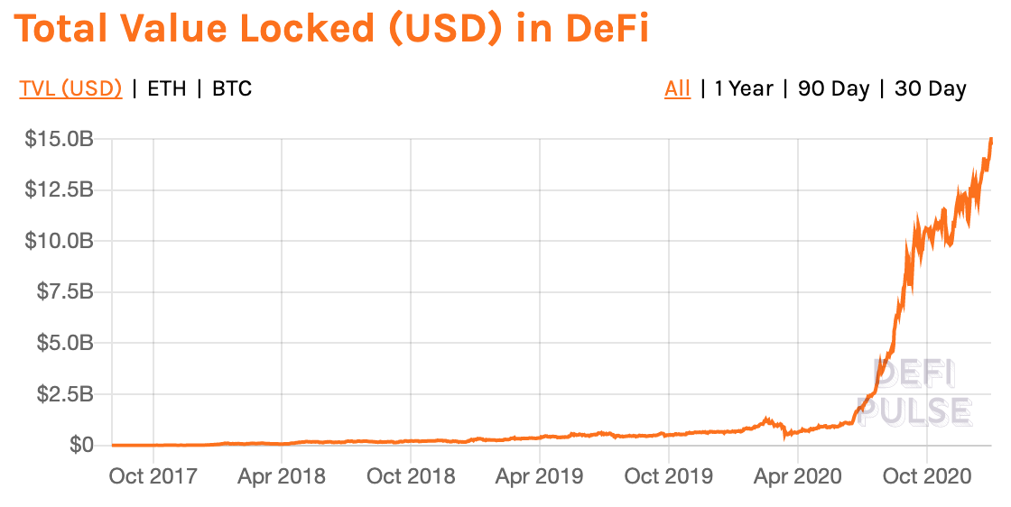 DeFi在今年取得长足发展。年初,DeFi协议总锁仓量逾6亿美元,至年中达到10亿美元。此后,流入DeFi市场资金不断增加,至年末逼近150亿美元。在2020这一年,DeFi锁仓量增长2300%。