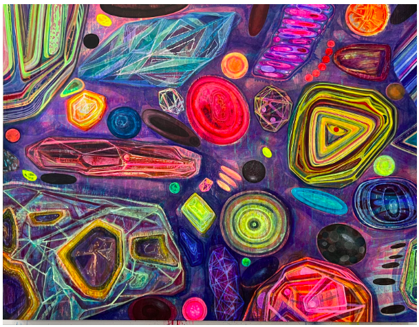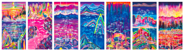 另一方面,黄宇兴极富个人特色与视觉冲击的浓烈艺术风格:具有辨识度的气泡、矿石和河流是黄宇兴作品的基础要素,它们或冷峻、或跳脱地缤纷跃动在画面上,自由组合、层层嵌套,形成高耸的山岩、涌动的河流以及瞬变的长空。作品包含了对于自然循环的思考、对生命哲学的诠释以及对中国意蕴东方美学的禅意表达。