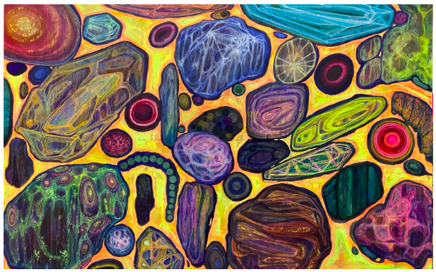 深埋地底经历几万年演化的宝石由矿物质组成,浩渺宇宙飞来的陨石也由矿物质组成,不同种类及纹路的矿石可视为千百万年来宇宙运动的痕迹;此外,回溯绘画艺术发展史,充当颜料的矿物质也扮演着重要角色。从某种意义上来说,矿石既是时间的见证者,也是变化的记录者。