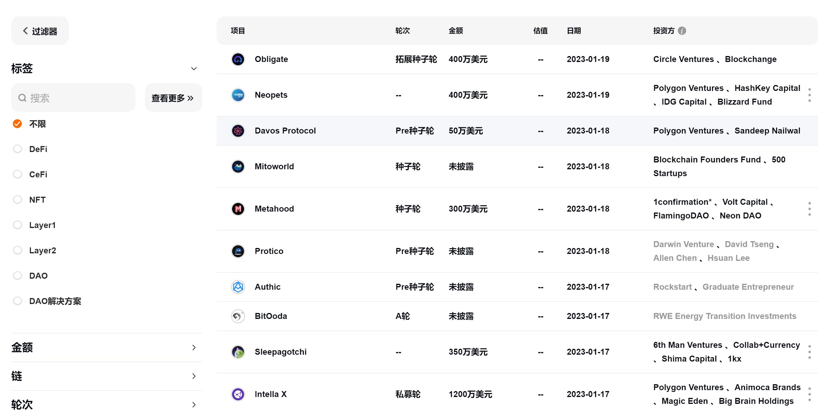 在“投融资”页面,Rootdata 按照时间顺序排列了迄今为止加密领域几乎所有公开的投融资记录,累计近 4000 条。同时,用户可以按照不同标签、融资规模、链、轮次和估值进行组合筛选,比如融资规模为100万-500万美元之间的 NFTFi 项目。