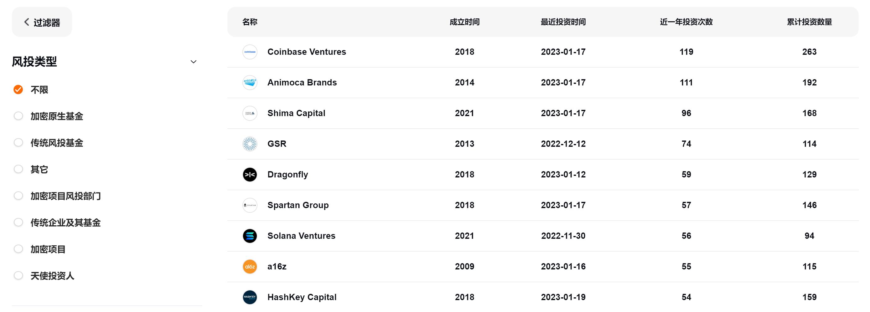 在“投资者”页面,Rootdata 收录了当前 Web3 领域超过三千个投资机构和个人,而且按照各自属性不同,分成加密原生基金、传统风投基金、加密项目、天使投资人等,便于用户按照类别细致筛选。另外,依据各个机构的成立时间、运营状态也可进行筛选。