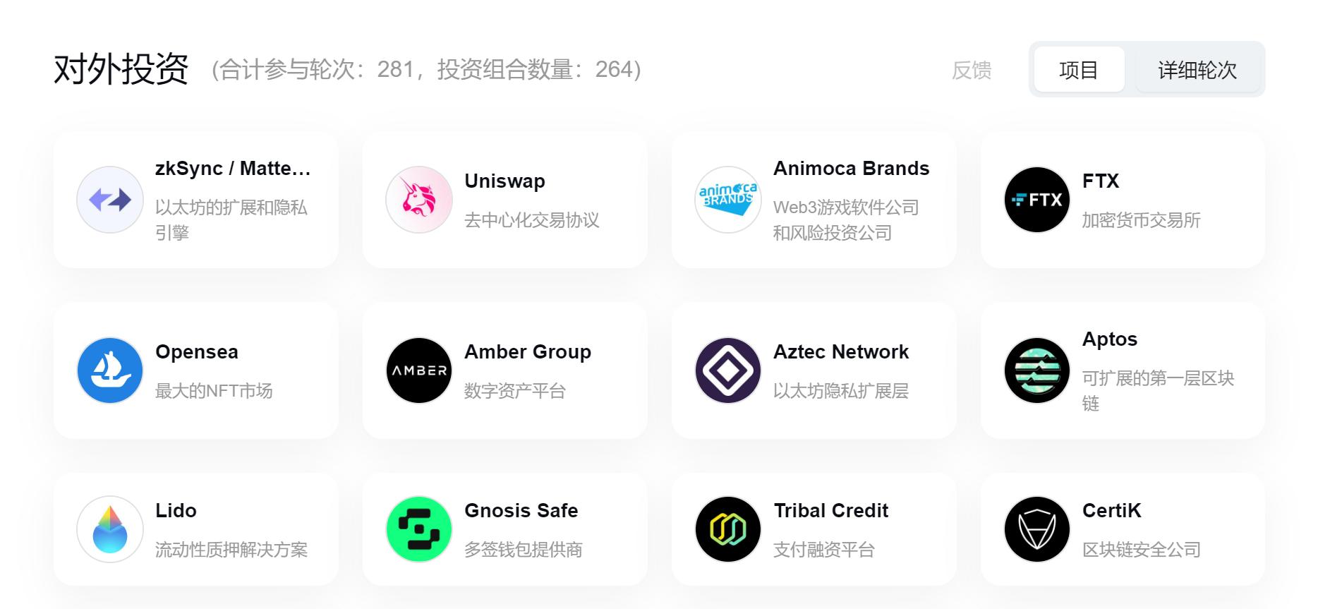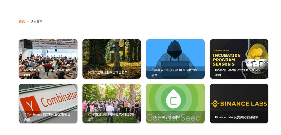 在“项目合辑”页面,Rootdata 按照不同的特征对零散数据进行了聚类整合,从而汇总成一份份的项目列表合辑。用户可以借此了解到诸如“2022 年加密行业死亡项目清单”、“币安历史孵化项目名单”、“Coinbase 前员工创业项目清单”、“YC 历年孵化项目清单”等信息。