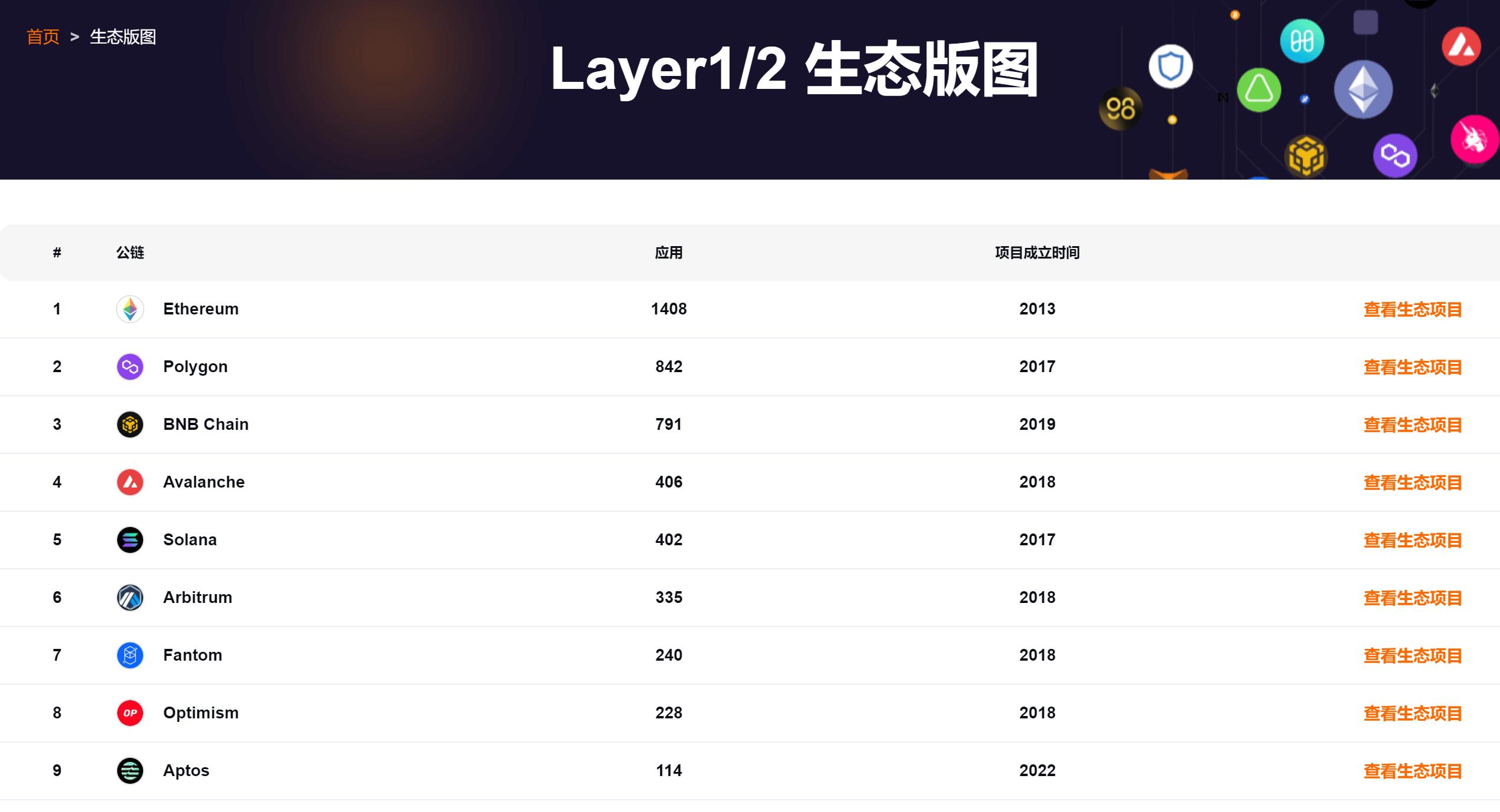 在“生态版图”页面,Rootdata 按照生态项目数量对超过 150 个 Layer1/2 进行了排名,用户可以查看任意 Layer1/2 生态发展状况以及具体的生态项目,也可以根据细分标签、轮次、估值、运营状态等对其生态版图进行详细筛选,包括未上线项目、测试网项目。