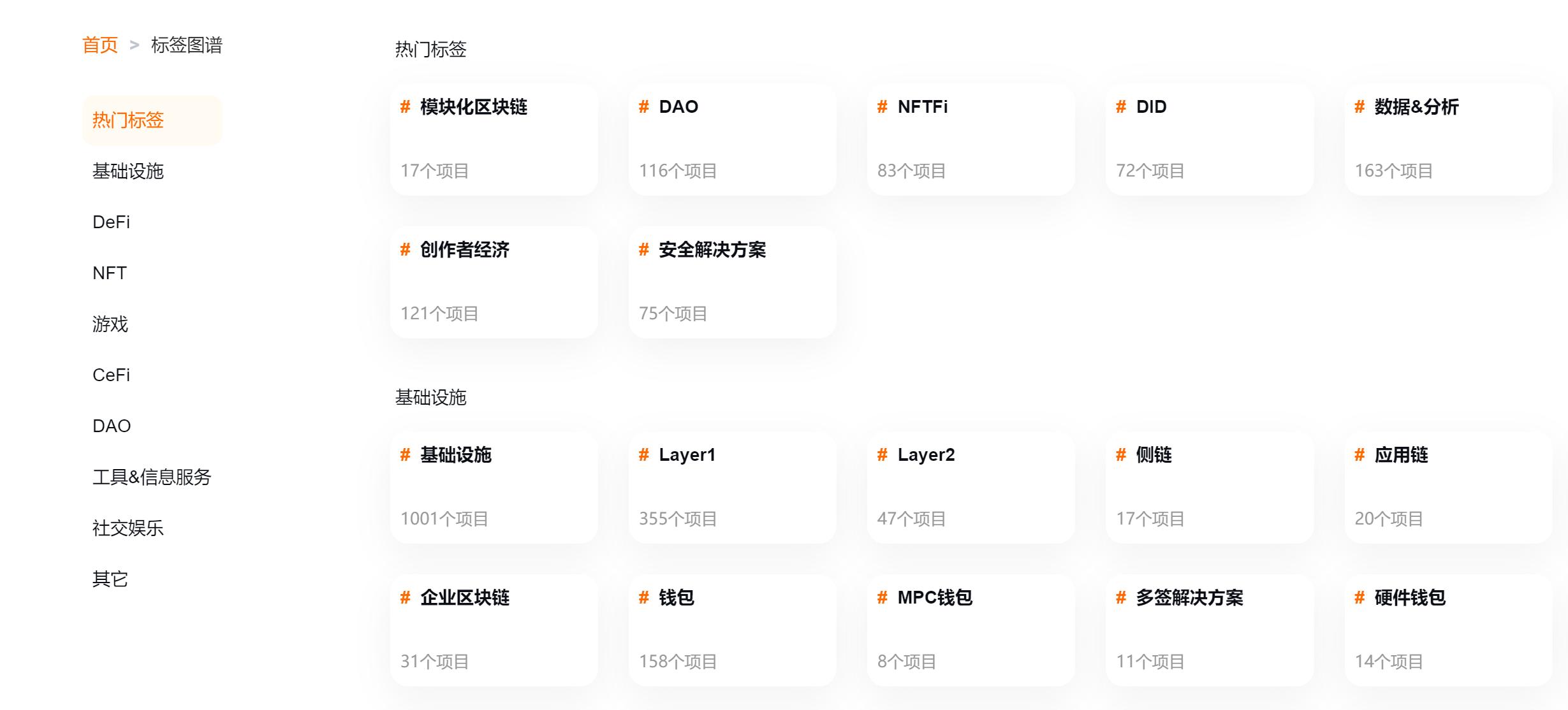 在“标签图谱”页面,Rootdata 将所有的 Web3 项目按照九大赛道进行分门别类,分别是基础设施、DeFi、NFT、游戏、CeFi、DAO、工具&信息服务、社交娱乐和其它。每个赛道又有更加垂直的分类和标签,比如NFT赛道下有NFTFi、NFT AMM、数字时尚等标签,DAO赛道下有投资DAO、服务DAO、DAO解决方案等,以便读者查找细分方向的项目。