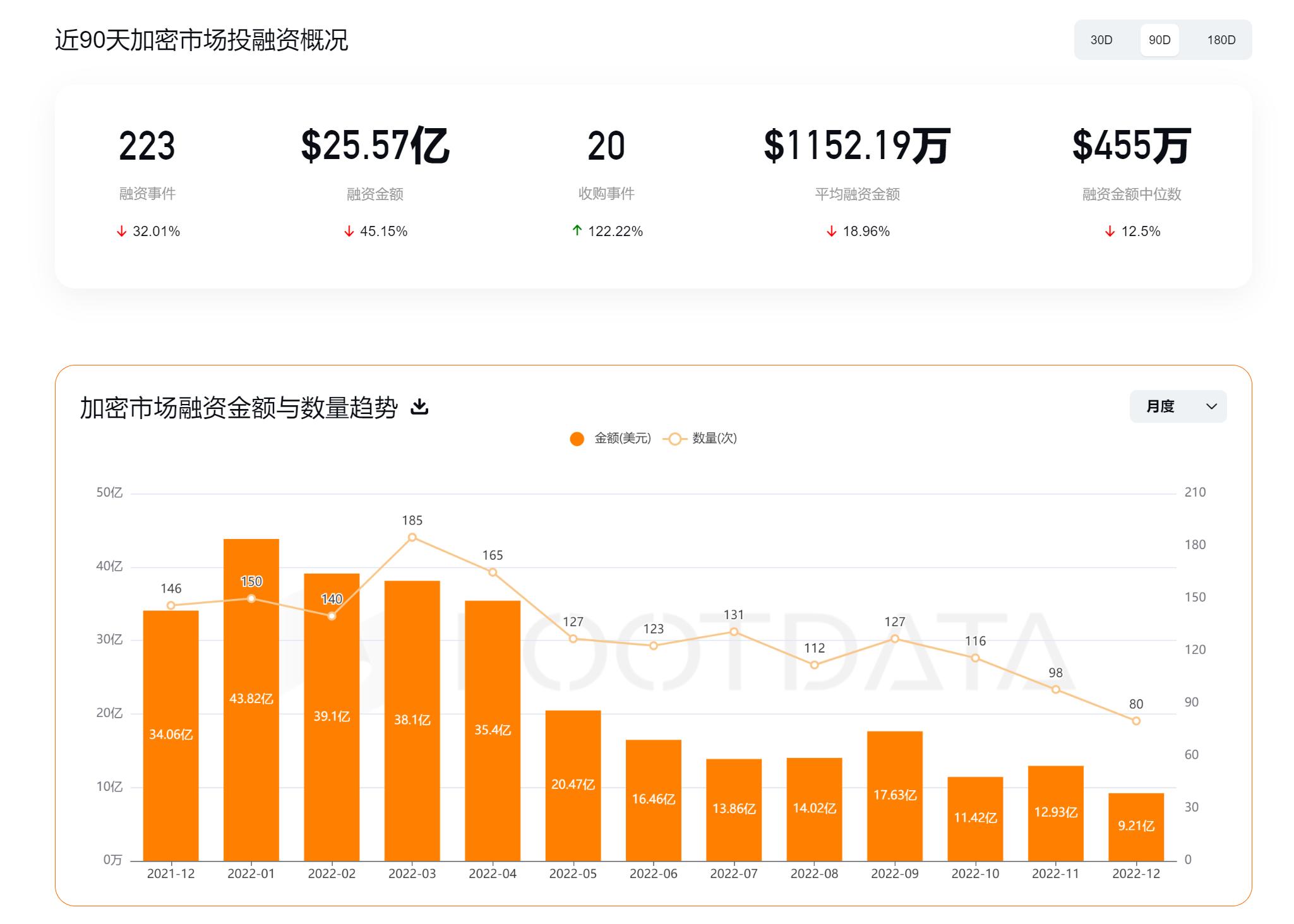 在“图表”页面,Rootdata 将海量的投融资等数据进行了可视化处理,便于用户了解自选时间段内一级市场投融资的趋势变化、每个月度和季度各赛道的融资笔数和融资金额、融资规模最大的 10 个项目以及不同公链的生态情况。