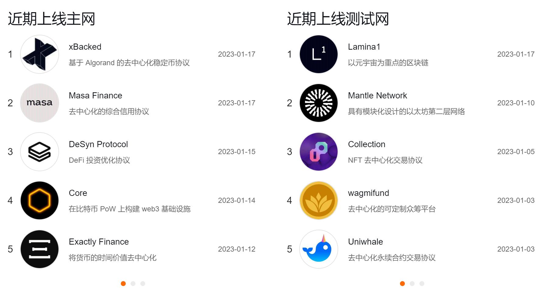 此外还网站首页,Rootdata 还有非常实用的小功能,即近期上线主网、测试网的项目,用户们可以在这里发现新的投资、交互与创新机会。