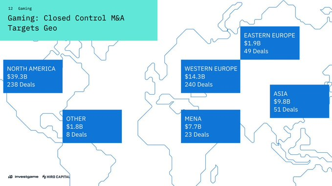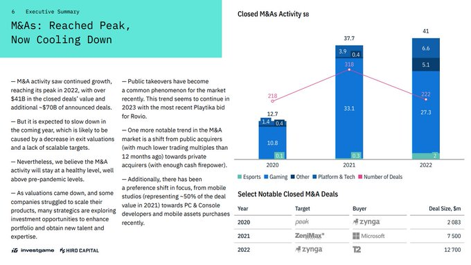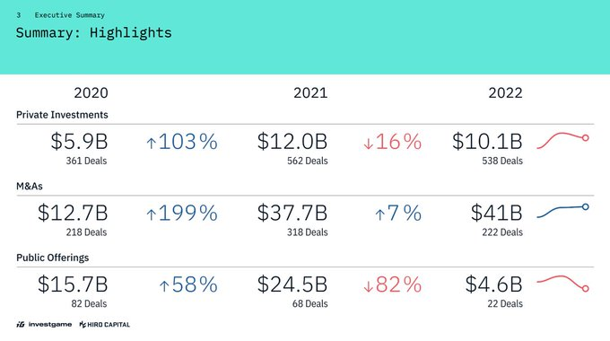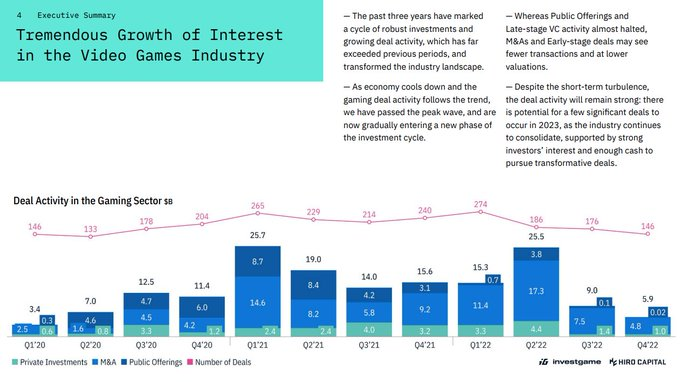 在过去的2022年一年中,共计发生了538笔 总额101亿美元的游戏行业投资,222起收购并购事件总额410亿美元,以及22个IPO上市共计46亿美元。