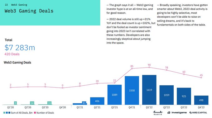 不管是从投资总额还是从投资数量来看,Web3游戏投资都是在一个很明显的低点,而且很显著得可以看到每一笔投资的金额都在变小,侧面体现行业早期项目整体估值降低。