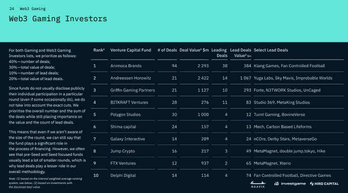 过去三年中最活跃的头部Web3游戏投资基金前五名分别为Animoca Brands,A16Z,Griffin Gaming Partners,BITKRAFT Ventures以及Polygon Studio。