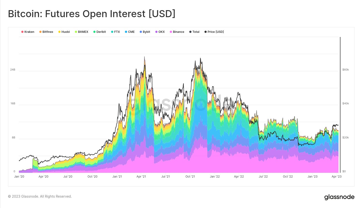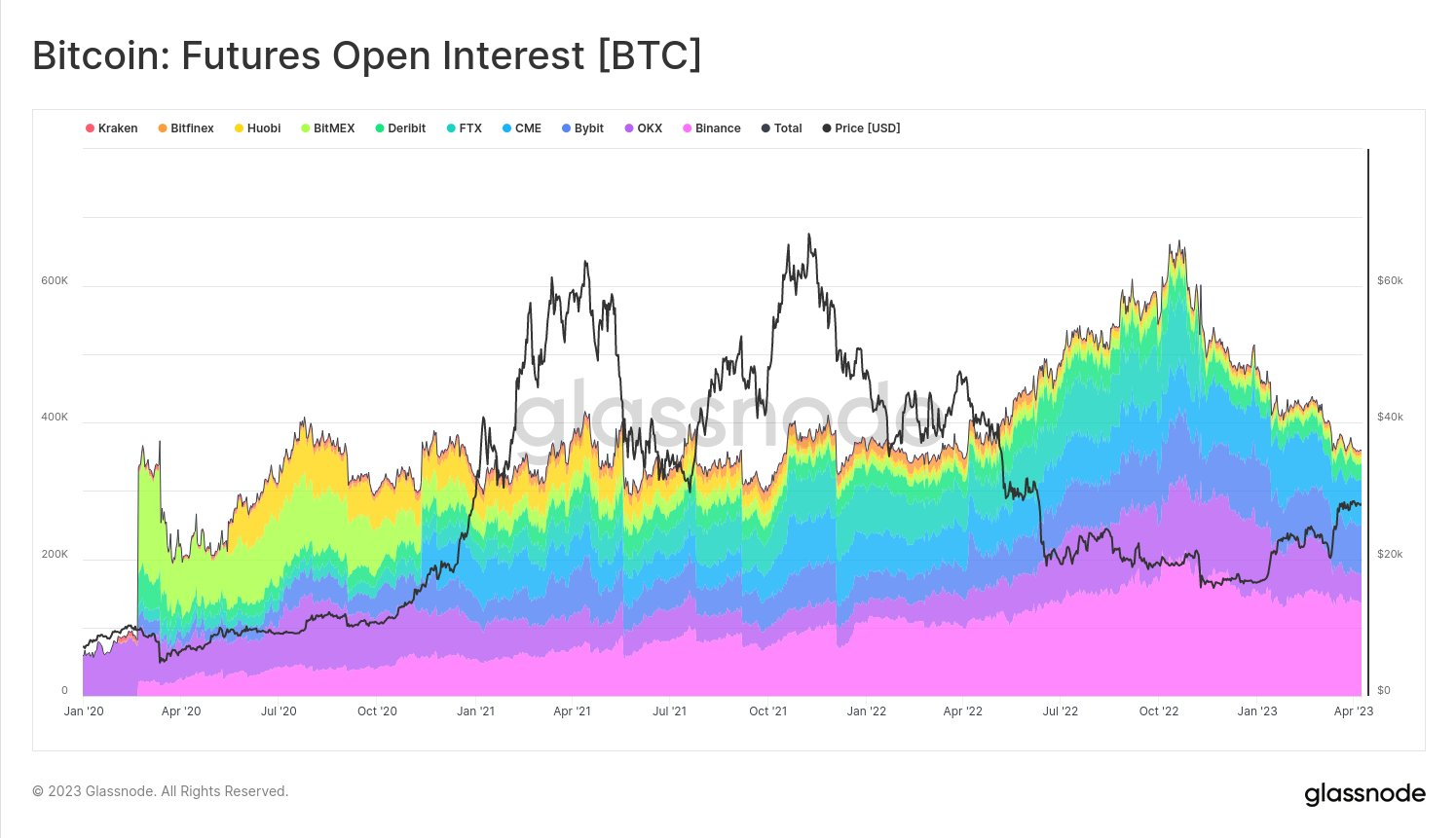 资金利率是正的……但几乎可以说没有。你可以通过做空$BTC赚取 2% 的收益.....或在货币市场上存入 5%资金。以BTC计价的总未平仓合约已经耗尽价值 1 年的杠杆,基于美元的未平仓合约回到了2020年历史高点之前的 20,000 美元水平。