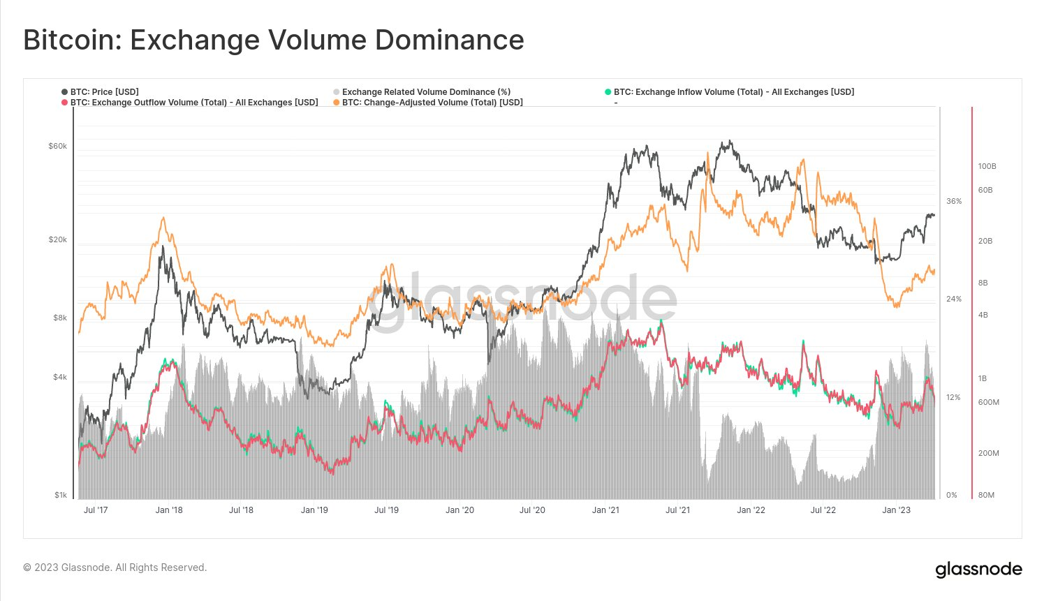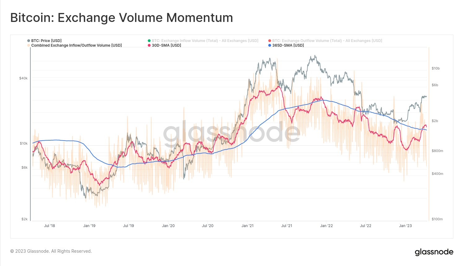 现货驱动的比特币市场往往会看到与交易相关的活动上升,BTC流入和流出都是为了交易。