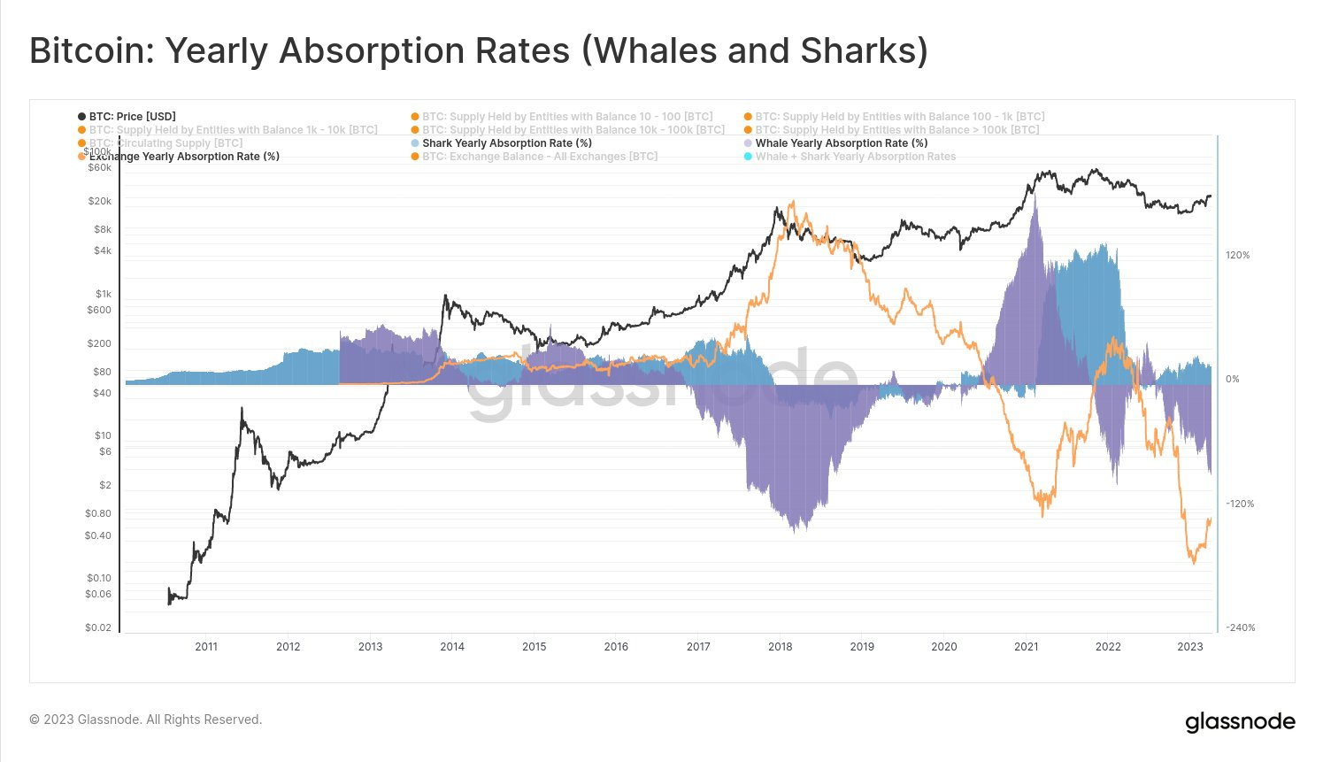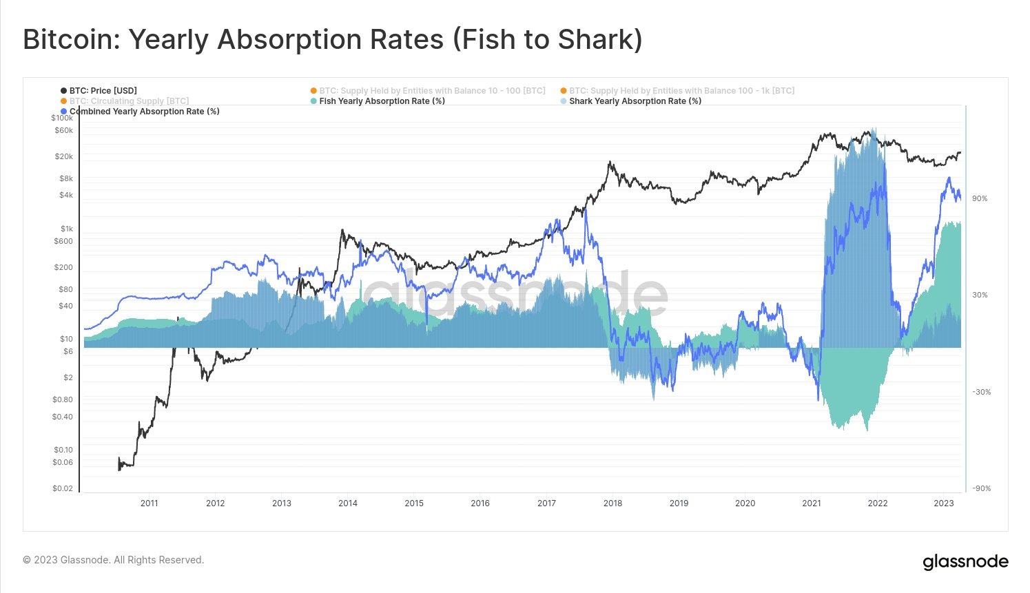 链上比特币钱包余额也在显著增长,虾到鱼甚至鲨鱼(均小于1k BTC)以接近ATH的速度吸收代币。
