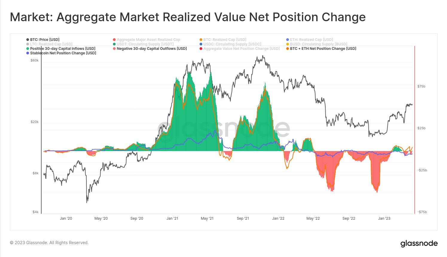 总体而言,市场正在看到稳定币的净资本流出,并每月略微流入50亿美元的BTC。