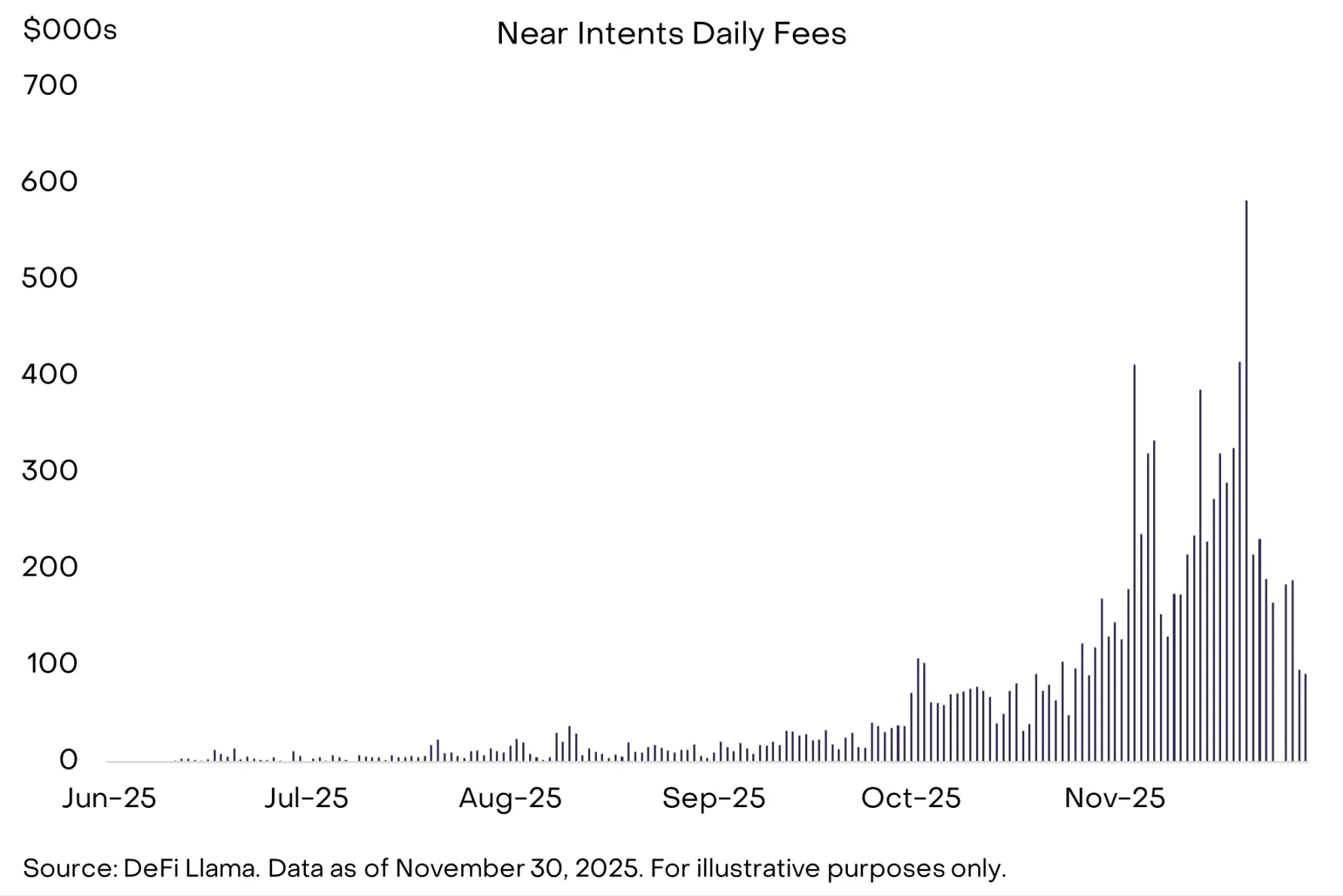 具体而言,作为 AI 加密资产板块中市值第二大的资产,Near 的 Near Intents 产品采用率持续上升(见图 7)。Near Intents 通过将用户的期望结果与一个 「解决方案提供者网络」 相连,由解决方案提供者竞争跨链执行最优实现路径,从而消除了跨链复杂性。这一功能已提升了 Zcash 的实用性 —— 用户可以私下花费 ZEC,而接收方则能在其他链上收到以太坊或 USDC 等资产。目前尚处于早期阶段,但我们认为这种整合可能在推动跨加密生态的隐私保护支付方面发挥重要作用。