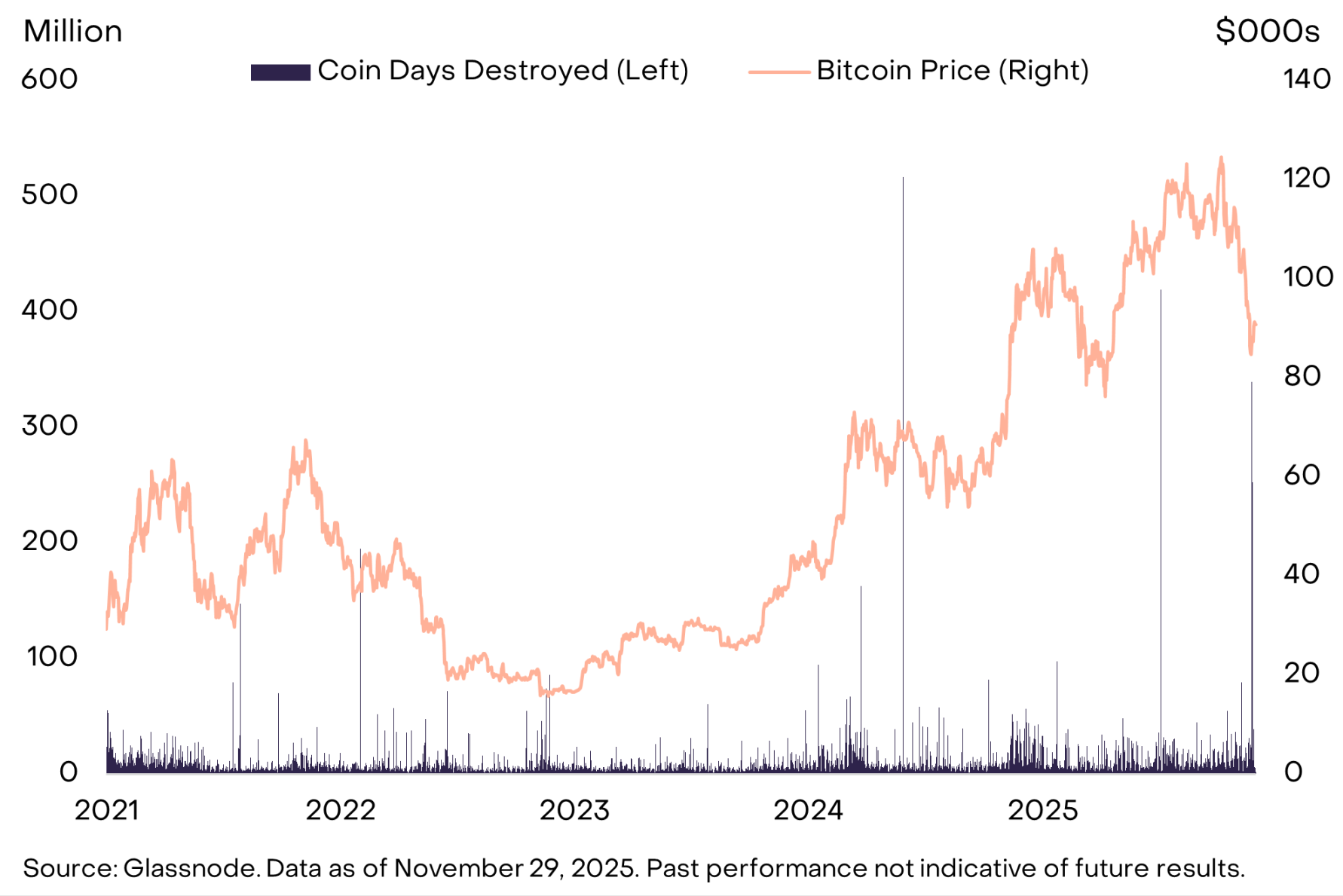 与此同时,多项资金流向指标显示需求仍显疲软:11 月期货未平仓合约进一步下降,ETP 资金流向直至月末才由负转正,且可能出现了更多早期比特币持有者的抛售行为。关于后者,链上数据显示 11 月末 「沉睡币激活量(CDD)」 再次激增(见图 5)(注:CDD 的计算方式为:交易的比特币数量乘以自上次交易以来的天数)。因此,当大量长期未移动的代币同时转移时,CDD 会上升。与 7 月的 CDD 激增类似,11 月末的这一增长可能表明大型长期持有者在出售比特币。对于短期前景而言,只有当这些资金流向指标(期货未平仓合约、ETP 净流入、早期持有者抛售)出现好转时,投资者才能更有信心判断比特币已触底。