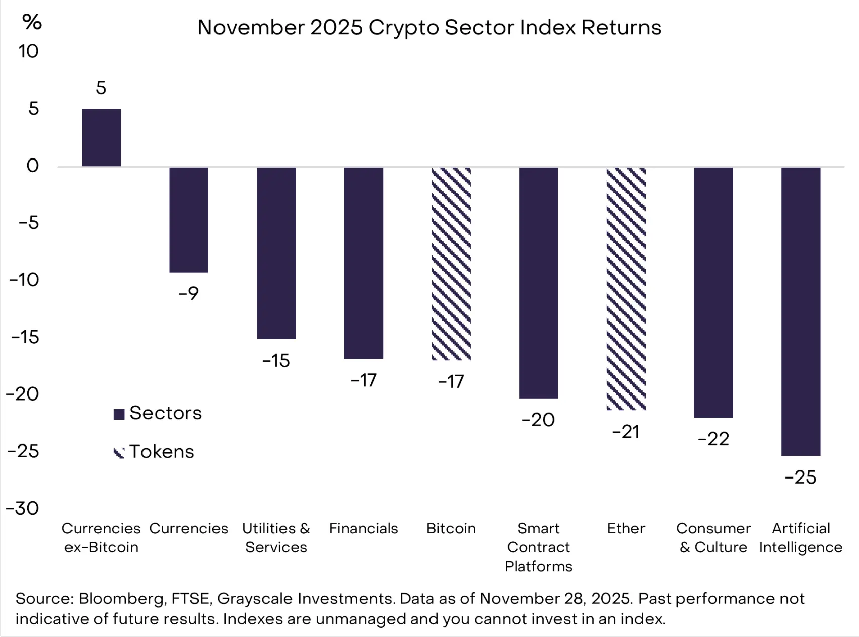 根据我们的加密行业分类指数(Crypto Sectors),11 月比特币的跌幅在可投资加密资产中处于中等水平。表现最佳的市场板块是 「货币类加密资产板块」(见图 6),剔除比特币后,该板块当月实现上涨。涨幅主要来自多款隐私类加密货币:Zcash(+8%)、门罗币(Monero,+30%)和 Decred(+40%)。以太坊生态系统中也涌现出对隐私技术的广泛关注:Vitalik Buterin 在 Devcon 大会上公布了隐私框架,专注于隐私保护的以太坊二层网络 Aztec 推出了其 Ignition Chain。正如在上一份月度报告中所讨论的,我们认为,如果缺乏隐私元素,区块链技术将无法充分发挥其潜力。