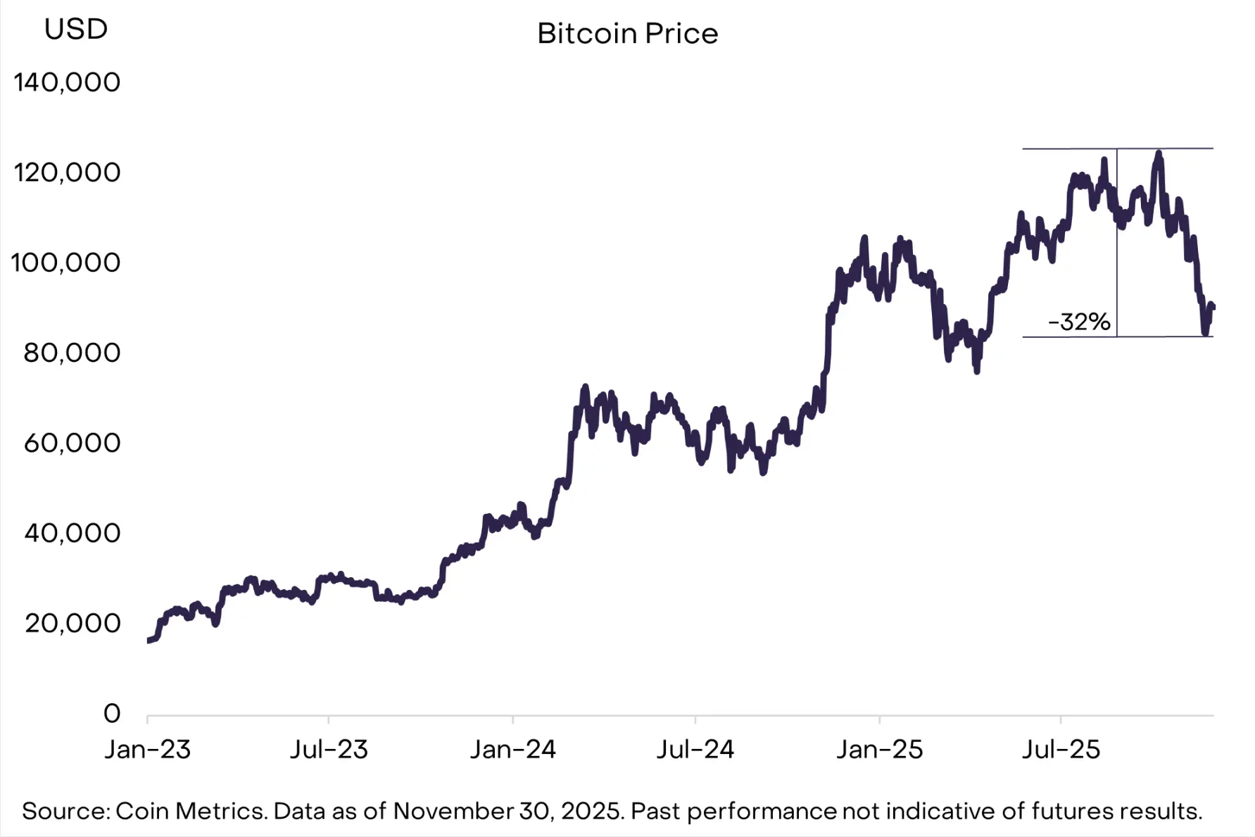 10 月初开始的比特币回调在 11 月大部分时间里持续发酵,最大跌幅达 32%(见图 1)。截至目前,此次回撤已接近历史平均水平。自 2010 年以来,比特币价格下跌超过 10% 的情况已发生约 50 次,这些回调的平均跌幅为 30%。自 2022 年 11 月比特币触底以来,已出现 9 次 10% 以上的下跌。尽管波动剧烈,但这在比特币牛市中并非异常现象。