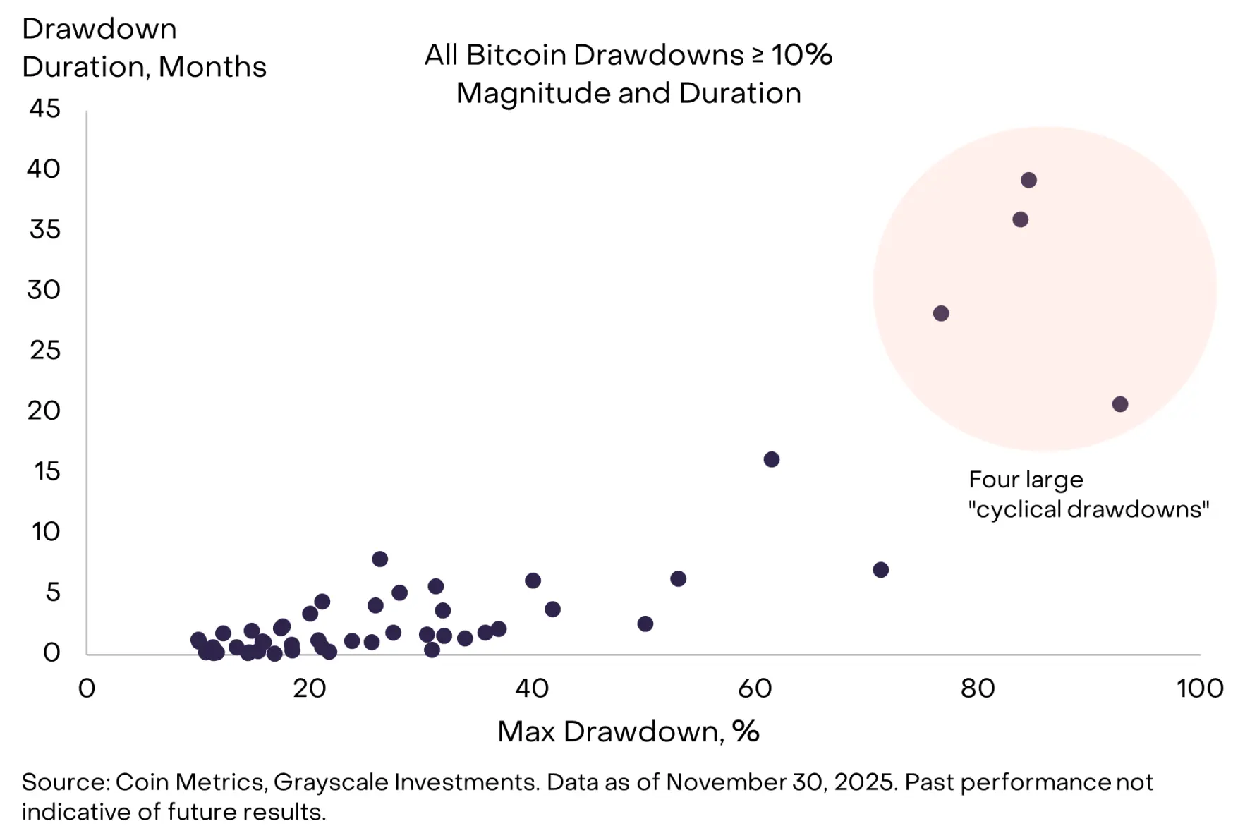 从历史表现来看,投资比特币通常能带来可观的回报,过去 3-5 年的年化收益率达 35%-75%。但与此同时,比特币也经历了多次大幅回调:其价格通常每年至少出现 3 次 10% 以上的下跌 。与其他所有资产一样,比特币的潜在投资回报可视为对其风险的补偿。长期坚持持有(HODL)的比特币投资者获得了丰厚回报,但在此过程中,他们也需要承受时而严峻的回调压力。