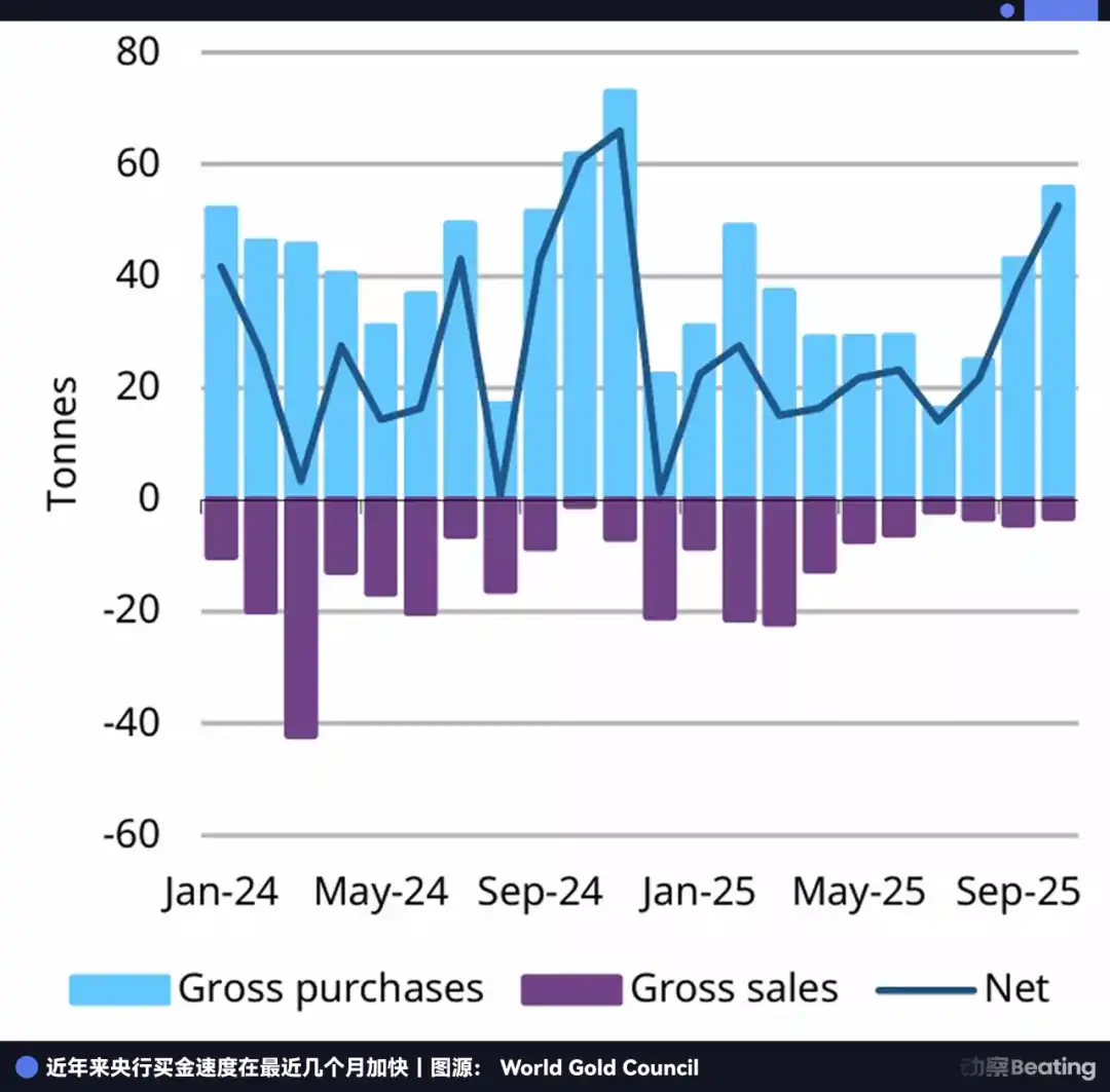 如果说白银的短缺是因为工业巨兽的吞噬,那么黄金的流失,则是因为一场国家级的「挤兑」。各国央行,那些曾经最坚定的美元持有者,现在正排在挤兑队伍的最前面。