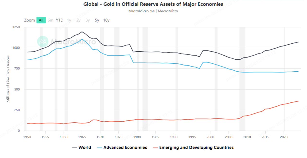 新兴经济体购持黄金力度激增https://en.macromicro.me/charts/120130/global-gold-in-official-reserve-assets-of-major-economies