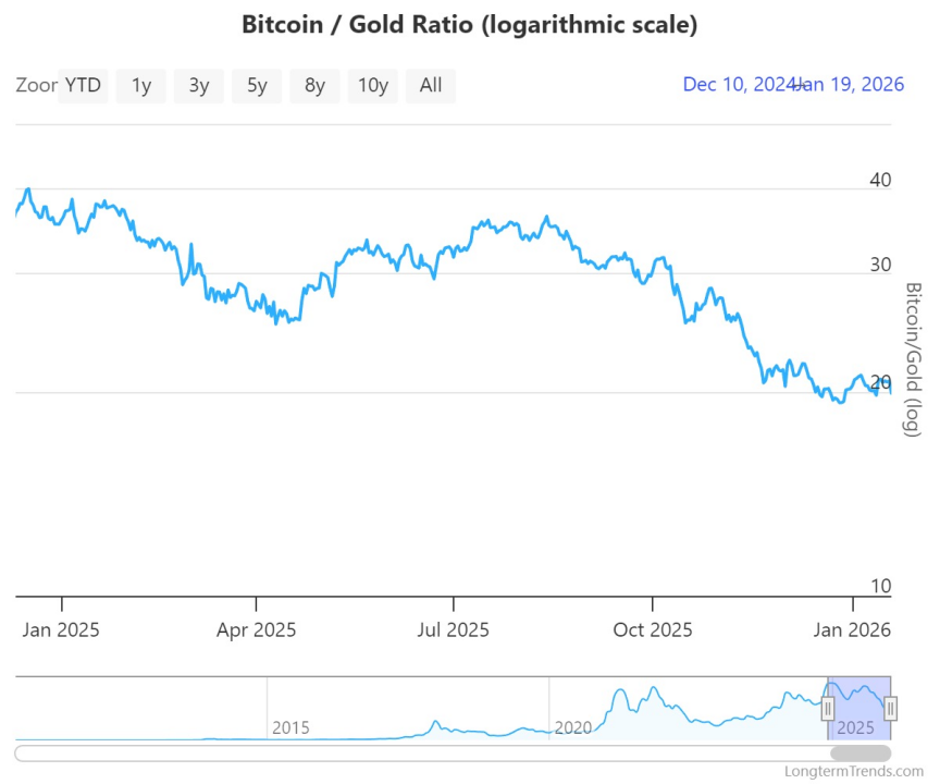 如下图所示,Bitcoin/Gold 比值从 2024 年底的最高点 40 一路下滑,目前已跌破 20,仍未有见底迹象。