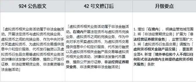924 公告规定:「任何法人、非法人组织和自然人投资虚拟货币及相关衍生品,违背公序良俗的,相关民事法律行为无效」;42 号文修订为:「任何单位和个人投资虚拟货币、现实世界资产代币及相关金融产品,违背公序良俗的,相关民事法律行为无效」,将投资标的从「虚拟货币及相关衍生品」扩展为「虚拟货币、现实世界资产代币及相关金融产品」,监管覆盖更全面。