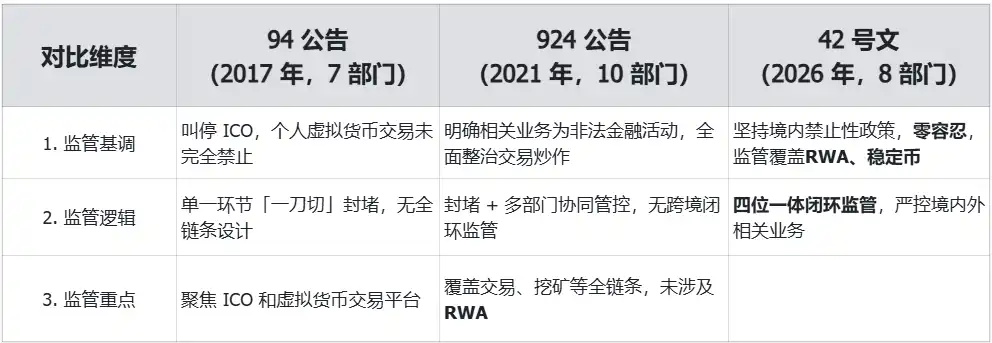 924 公告的监管范围仅针对虚拟货币相关服务,42 号文新增:「有关中介机构、信息技术服务机构不得为未经同意的现实世界资产代币化相关业务以及相关金融产品提供中介、技术等服务」,将监管范围正式扩展至 RWA 领域的中介与技术服务商。