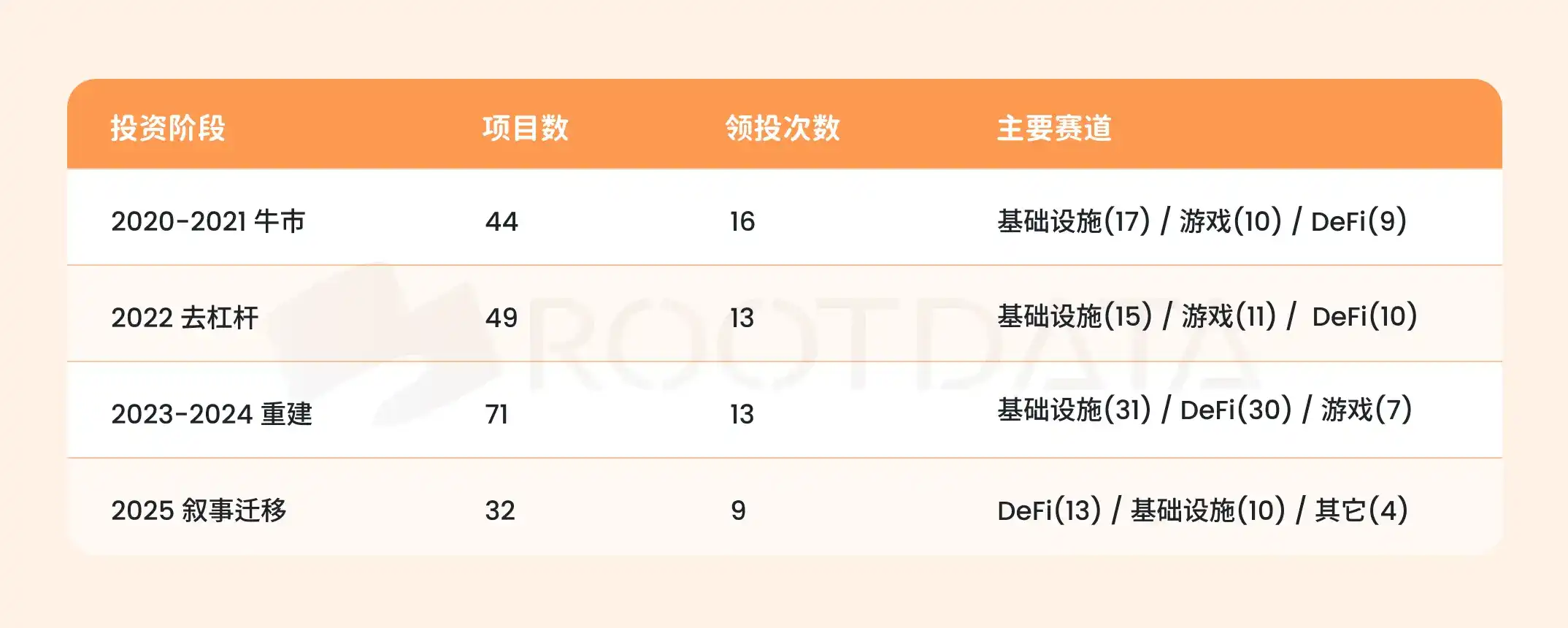 在赛道选择上,最明显的变化是游戏退潮——从牛市期的 10 笔跌至 2023–2024 年的 7 笔,再到 2025 年基本消失;DeFi 则持续走强,2025 年首次成为 YZi Labs 最青睐的赛道。基础设施是其底仓逻辑,无论牛熊从未缺席,Sui、Aptos、Movement 等均属此类。