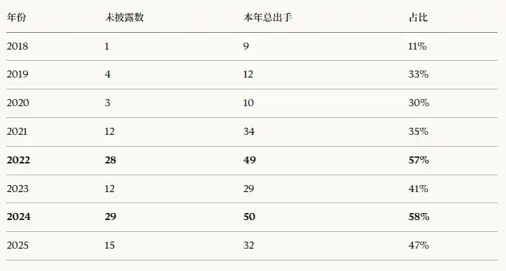 这个规律耐人寻味,熊市出手更不愿透露金额,可能是估值敏感,项目方不想暴露融资难的窘境;而2024年牛市高峰期未披露率同样高,更多是机构主动压信息,防止竞争对手跟进。
