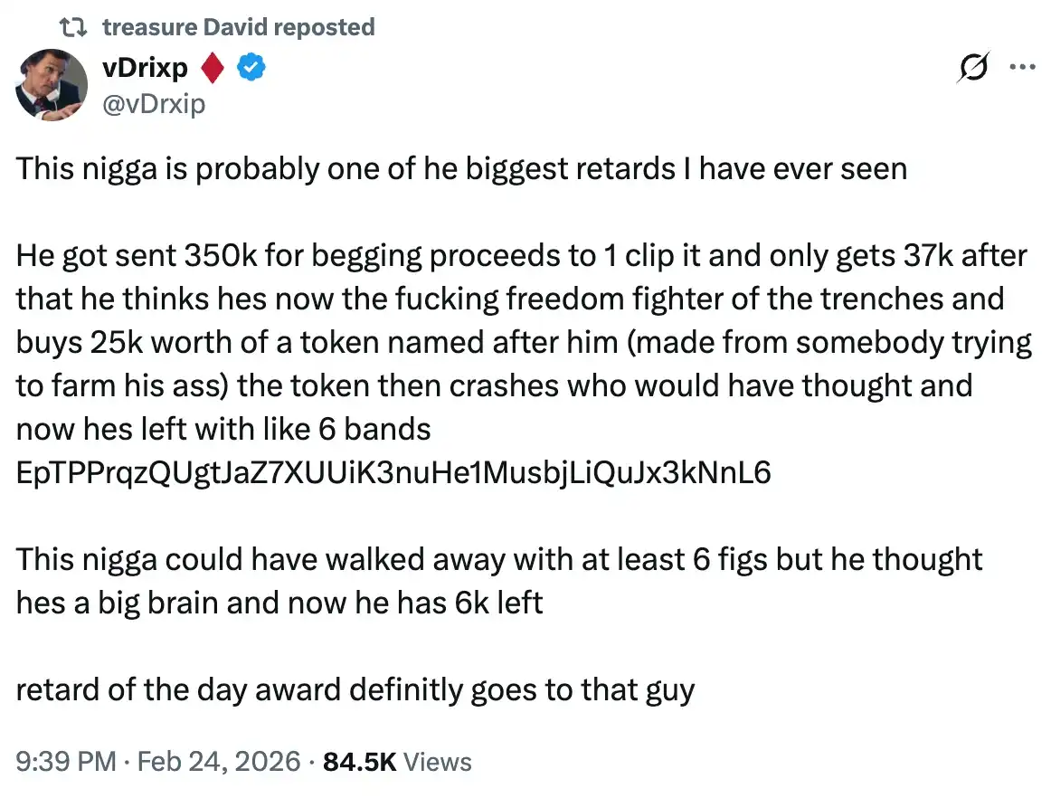 拿到 4 万美元之后,@treasureDavid 以为他获得了巨大的胜利,他要抓住这波自己创造出的流量机会。于是他选择拿出 2.5 万美元投资了一个以他自己名字命名的 Meme 代币,但这枚代币很快崩盘。仅仅一天时间,这笔投资就只剩下 6000 美元。到现在,他的钱包里只剩下 100 多美元。
