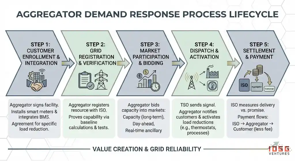 聚合商将这 2 MW(连同数千个其他站点)作为“需求响应资源”注册至 ISO。聚合商必须证明该资源确实能够交付,包括基线计算、计量协议,有时还需要测试调度。