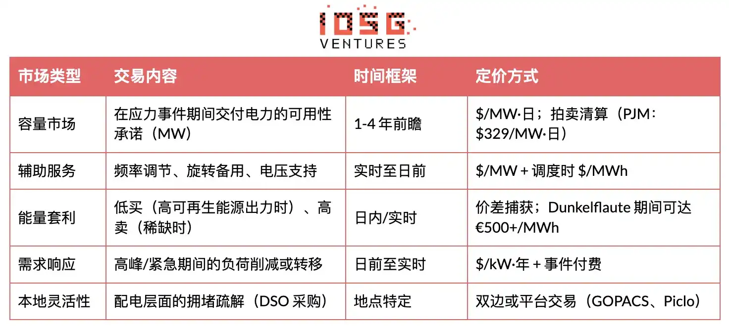 灵活性通过多种市场机制实现货币化,每种机制具有不同的时间框架、产品形态和定价结构。供应商可跨多个市场进行"收益叠加"(Revenue Stacking),以最大化资产回报。