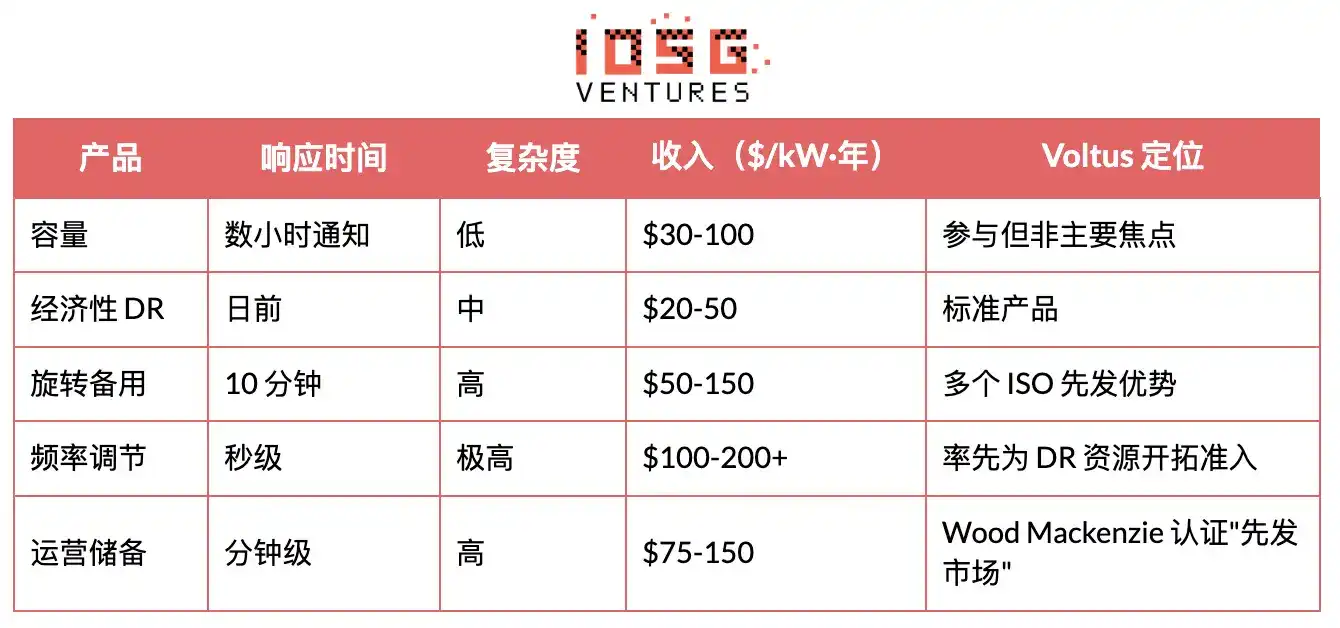单位 $/kW 更高(容量市场的 2-3 倍);竞争者更少(复杂性构成壁垒);需要精密软件(Voltus 的优势所在);但要求更快响应的资产。
