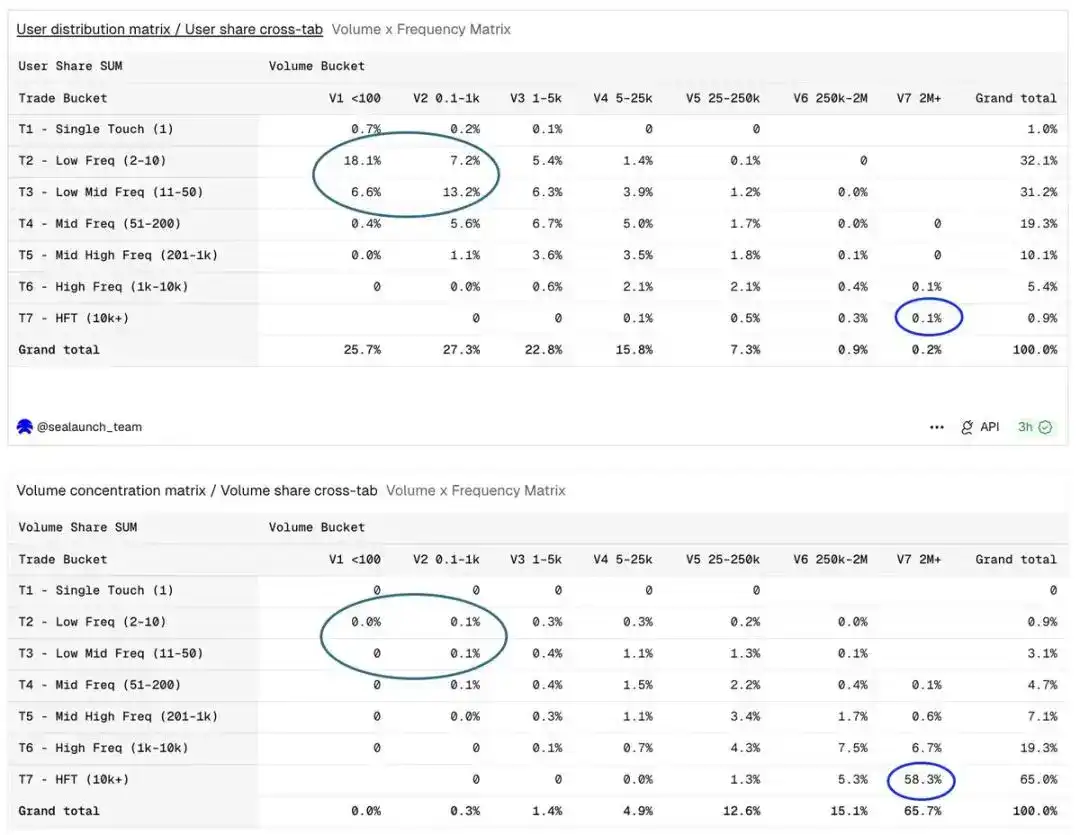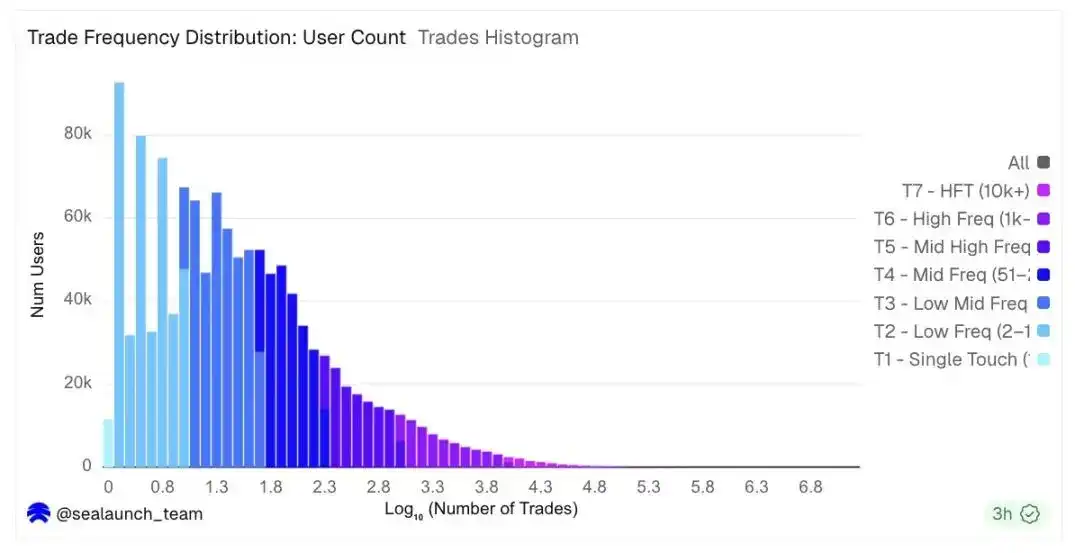 这两个直方图共同揭示了结构上的分裂:一部分是低频参与者;另一部分是高交易量参与者,他们在用户图表中的足迹几乎看不见,但他们对交易量图表的影响却占据主导地位。