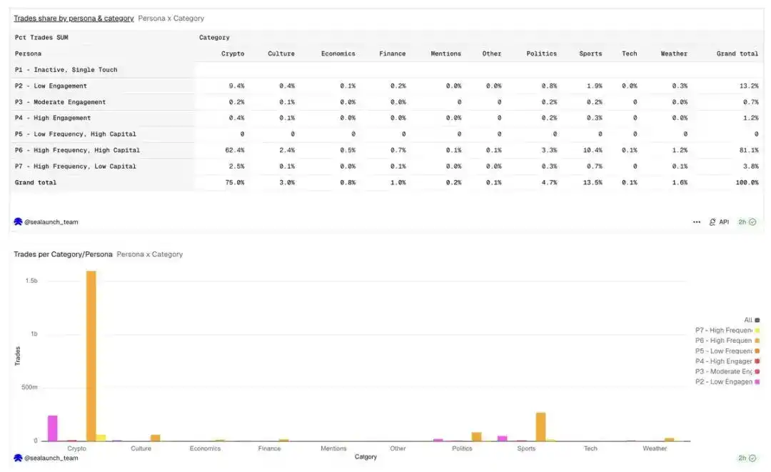 一个新的加密货币市场会吸引算法交易者和高频交易者;一个新的政治市场则会吸引受事件驱动的参与者,他们可能在事件结束后就再也不会回来了。像二元期权或结构化结果市场这样更特殊的市场形式,可能会进一步吸引高频高资本(P6)用户群体,而这些系统性交易者已经主导了加密货币市场。如果目标是交易量,那就面向 P6 用户群体构建。如果目标是用户增长和品牌影响力,那就面向 P2 用户群体构建。这两个目标需要截然不同的品类选择。