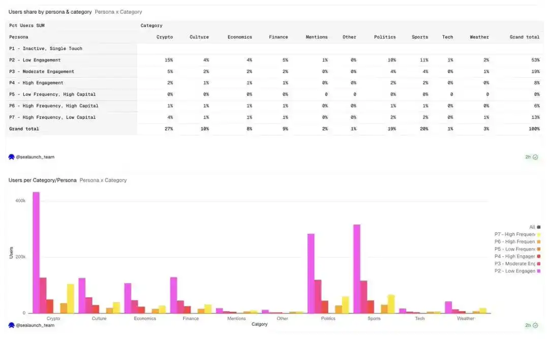 政治类用户占比最高,达 19%,但用户数量在各类用户群体中分布较为均匀。低参与度用户(P2)在政治类用户中的比例最高,与其他类别相比,这类用户通常是受事件驱动的一次性散户,他们注册账户是为了参与选举投注。
