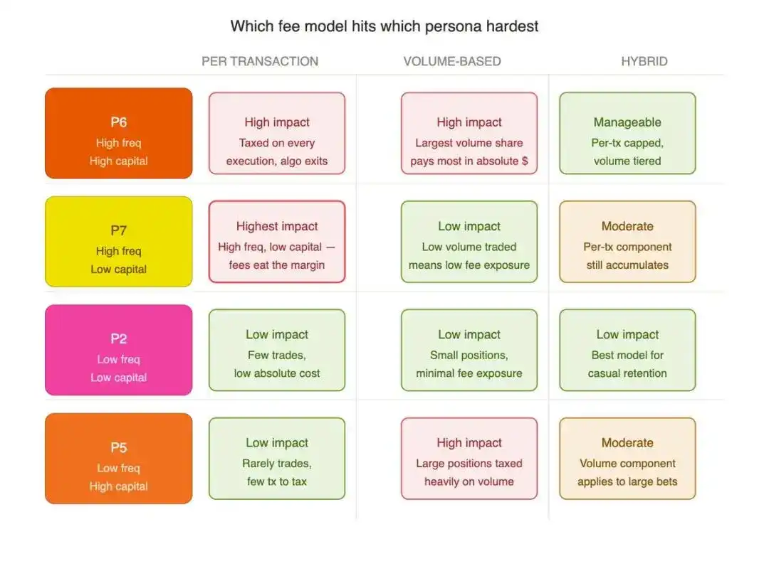 固定单笔手续费模式,会过度压制 P6 高频高资本、P7 高频小额群体;而恰恰是这批人,撑起了平台赖以生存的流动性底盘。
