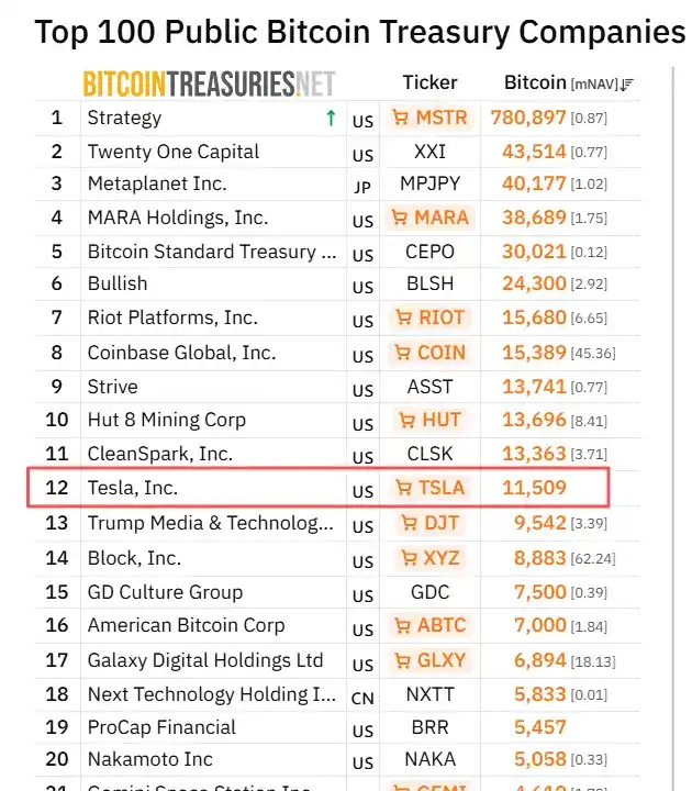 目前特斯拉持有约 11,509 枚 BTC,是已知上市公司中第 12 大持有方。SpaceX 作为私人公司持有 8,285 枚 BTC,市值约 6 亿美元,在已知企业持仓中同样排名靠前。两家公司的持仓也反映出马斯克及其团队认可比特币作为资产的价值,愿意将其纳入公司的财库配置。