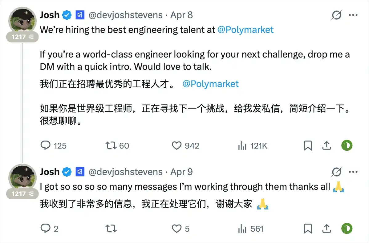3 月 24 日,前 Aave 工程师、高级副总裁 Josh 发文宣布加入 Polymarket。而在短短半个月后,其就已在个人账号下再次发文招募工程师。看得出来,业务高速发展的 Polymarket 的开发者缺口远比外界想象中的更大。