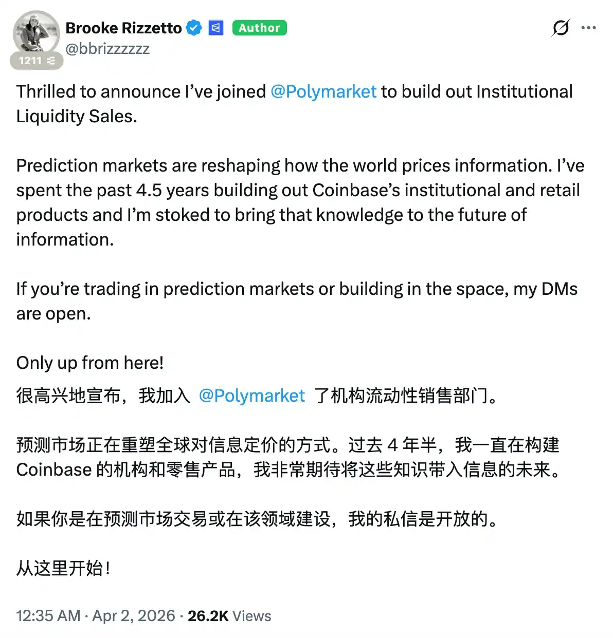 4 月 2 日,前 Coinbase 机构及散户产品负责人 Brooke Rizzetto 官宣加入 Polymarket,并表示后续将负责“机构流动性销售”。在 Coinbase 工作逾 4 年后,Brooke Rizzetto 开始从预测市场赛道寻找新的信息定价、流动性引入途径。