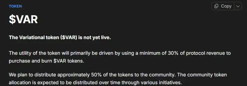 根据社区成员反馈,Variational 在 TGE 方面虽无官方确切日期,但社区和 Polymarket 普遍预期在今年 Q3 至 Q4(因官方文档中表示,积分计划最晚结束于 9 月 30 日)。此外,根据文档内容,项目承诺约 50%代币供应分配给社区(通过积分、收入分享等多种机制,而非单一空投),同时计划用至少 30%协议收入进行 VAR 代币回购与销毁,治理和价值捕获机制相对清晰。