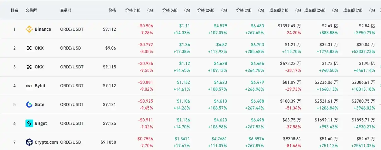 4 月 16 日,ORDI 从 3.4 美元开始跳涨,日内最高触及 9.68 美元,单日涨幅超 160%,盘中一度超过 190%。多个交易平台 24 小时交易量暴涨,Binance 现货 24 小时成交额达 2.49 亿美元。