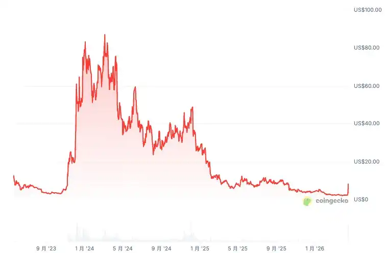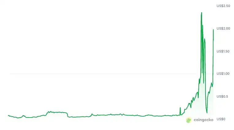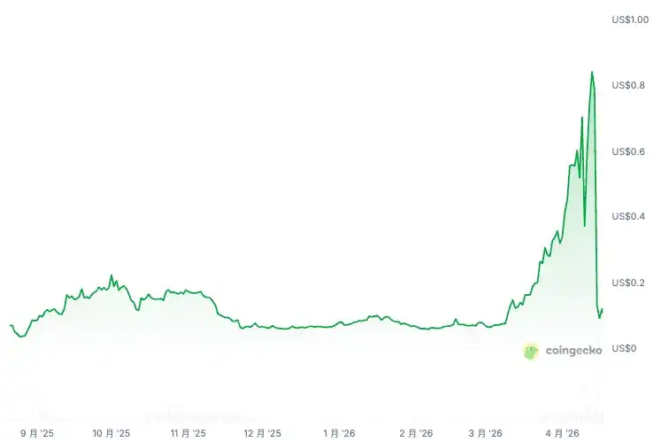 SIREN:3 月 22 日,SIREN 单日从 0.94 美元拉升至 4.81 美元,涨幅 144%,但收盘仅守住 2.31 美元,留下一根极长的上影线。此后在 1.5 至 2.8 美元区间反复震荡,4 月初快速回落至 0.5 美元附近,几乎回吐全部涨幅。4 月中旬再次脉冲回到 1.7 美元,但远低于前高。