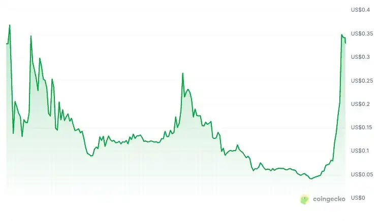 币安人生:币安人生在今年 1 月上线 Binance 后冲高至 0.26 美元附近,随后进入长达两个月的阴跌,从 0.26 一路滑落至 3 月底的 0.04 美元低点,回撤超过 80%。在底部横盘约两周后,4 月中旬突然启动第二轮拉升,几根连续大阳线将价格从 0.08 美元直接推至最高 0.39 美元,随后小幅回落至 0.33 美元附近。